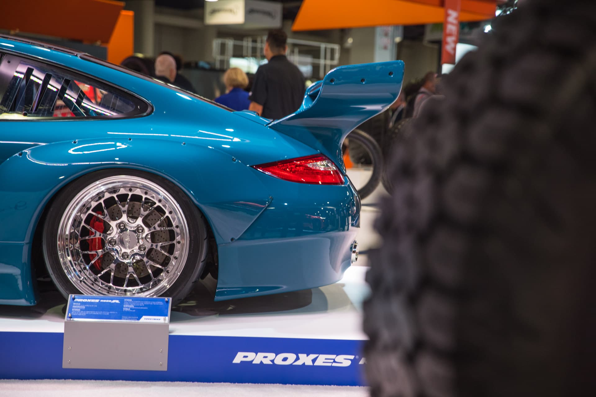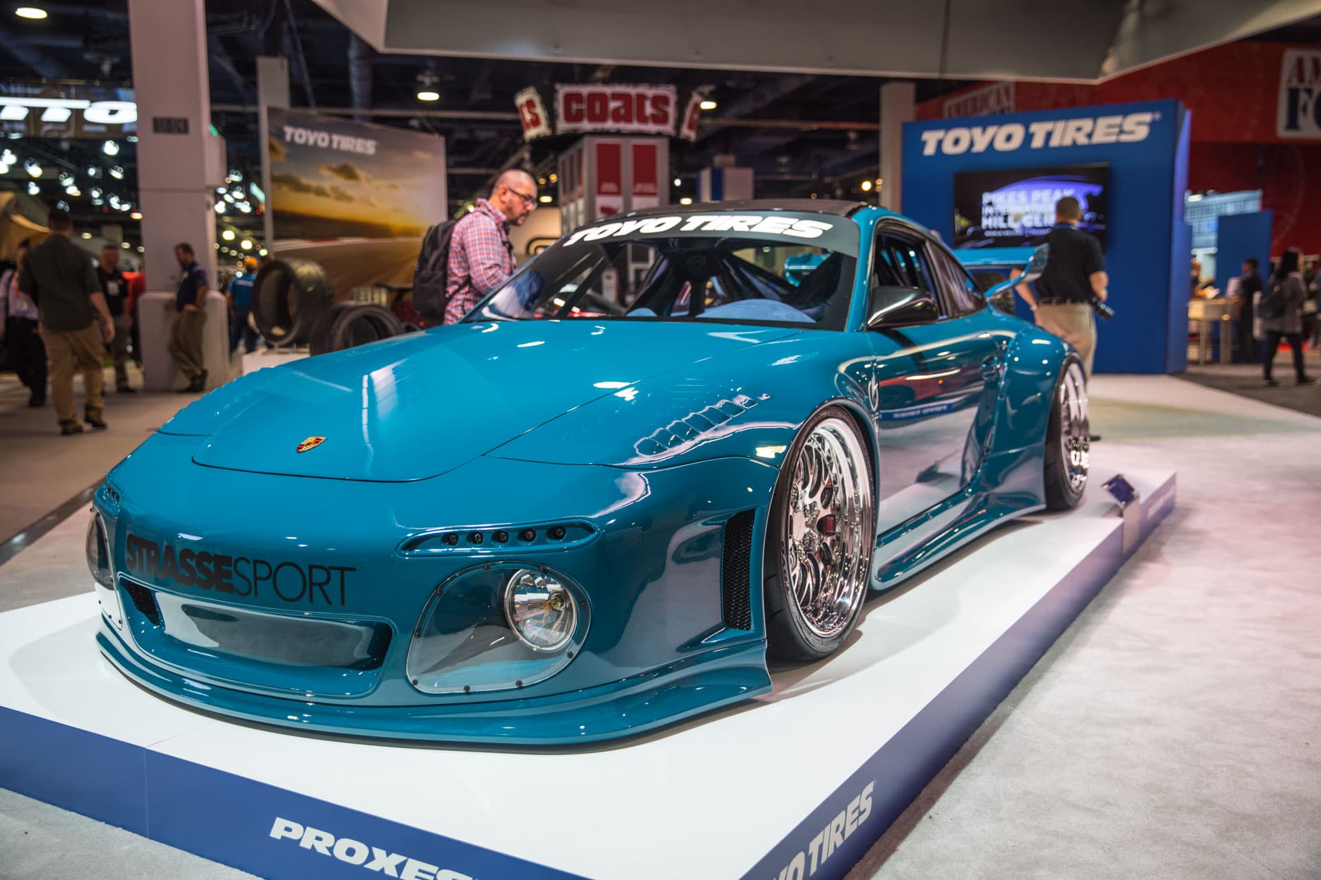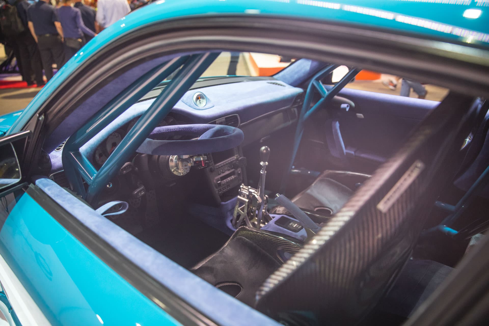 The Porsche 964 boasted super-wide arches, satin black bodywork and classic rally-inspired fog lights, complete with bucket seats, an exposed intercooler and a big ol’ Bisimoto turbo tucked under the rear bumper.