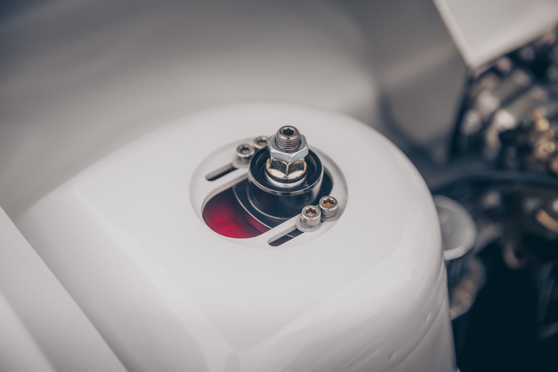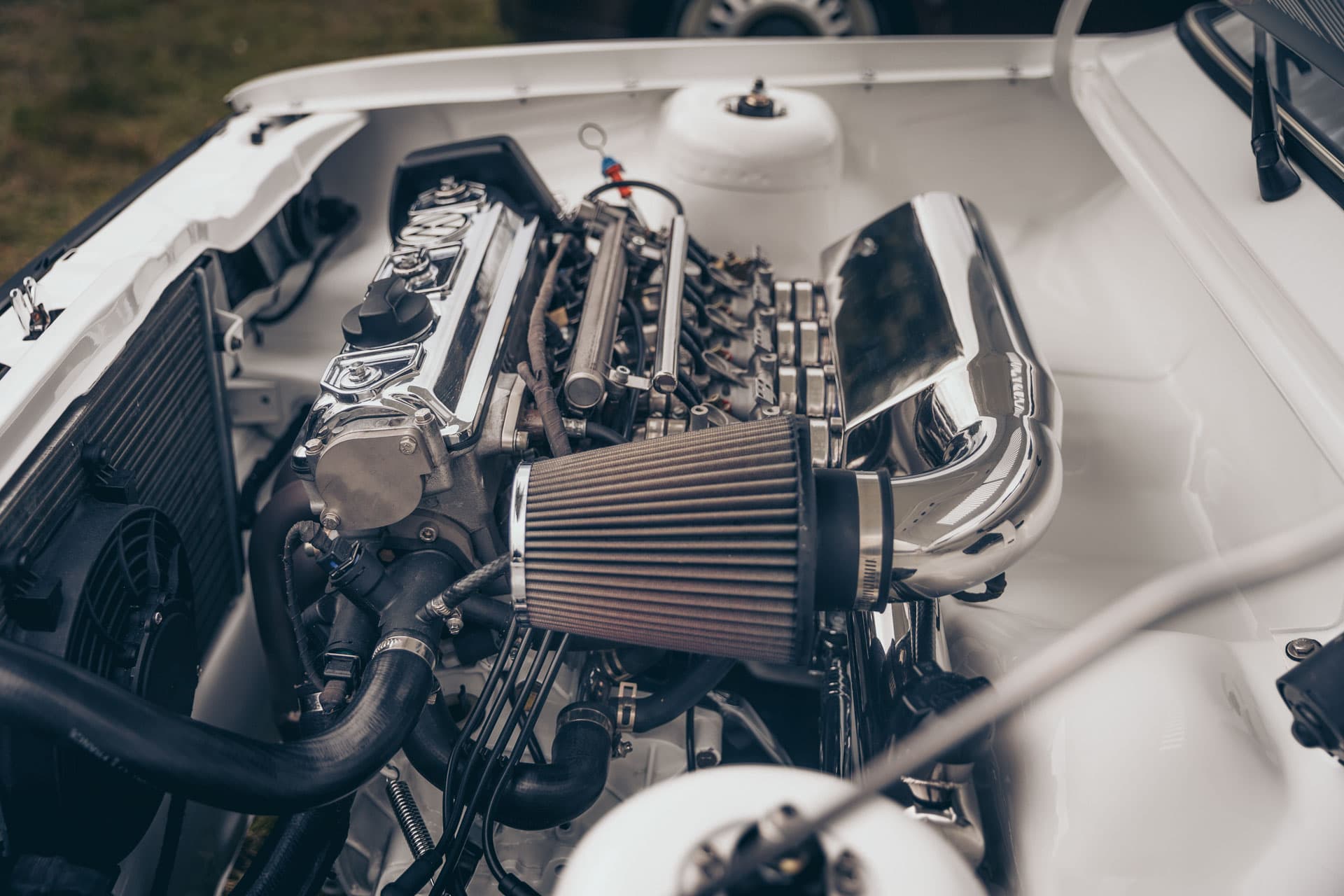 Upon further inspection, the car featured a modern, multi-throttle fueling system and an Air Lift Performance air suspension. Those tell-tale red camber plates completely gave it away, hiding under those white strut towers.
