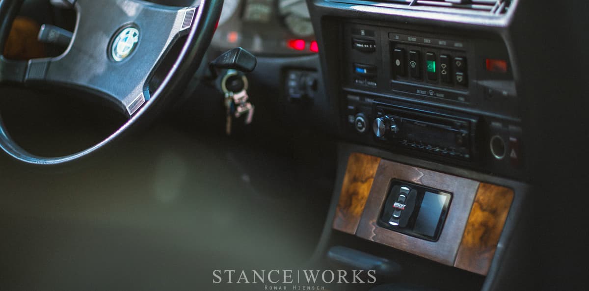 Touches of custom work are evident throughout the car, including a wood-trim mount for the Air Lift Performance 3H controller in the center console. While it is a stark contrast to the rest of the interior’s early electronics, it works seamlessly with the rest of the car to drive low and park lower.