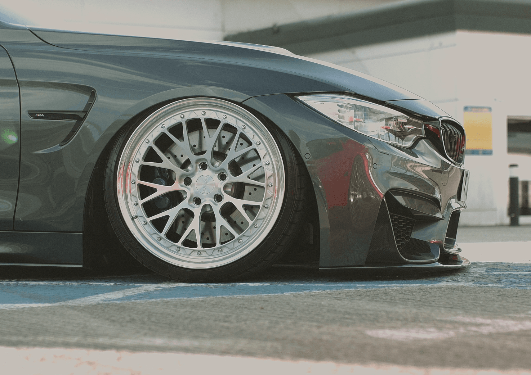 In the left corner is Parm’s F80 M3, sitting pretty on Rotiform LAS-Rs and looking seriously bold courtesy of its Sakhir Orange paintwork. In the right corner is Raj’s F82 M4, a much more subtle approach thanks to its silver Rotiform LSR wheels and Mineral Grey paintwork. Both pack a 450bhp RWD punch, both sit perfectly on Air Lift Performance suspension.